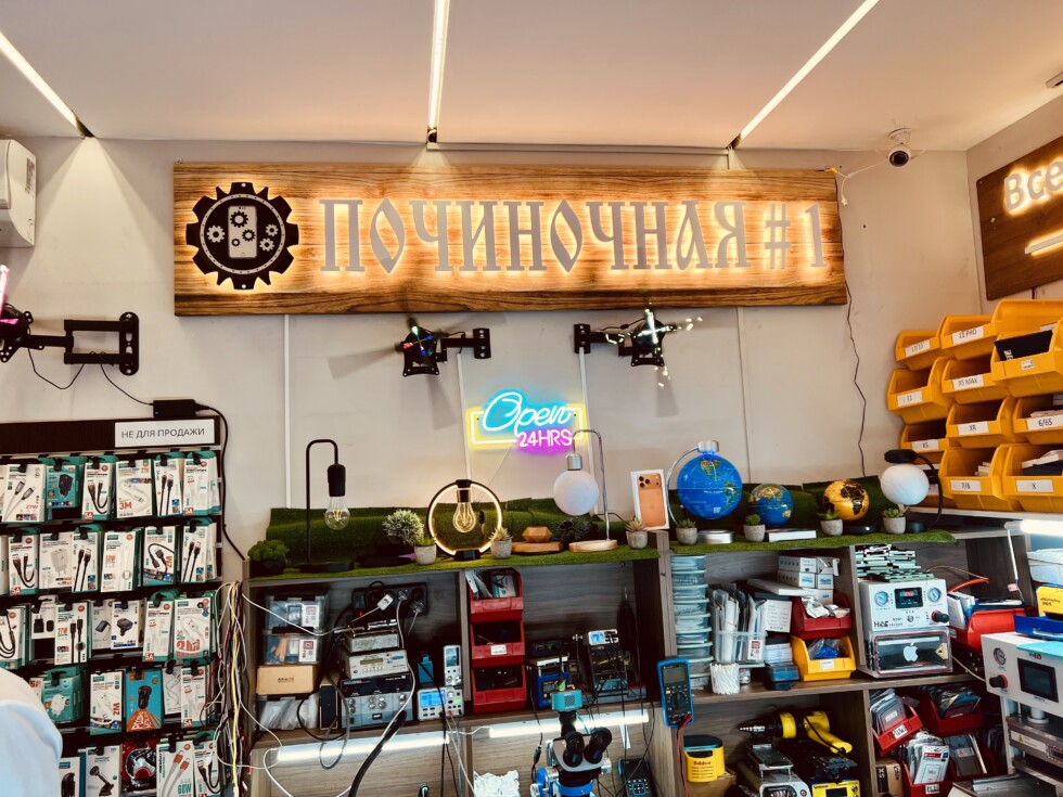 - Выглядит сервисный центр стильно, можно долго разглядывать разные забавные вещи и читать интересные надписи.